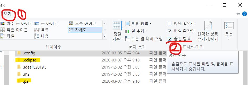 보기에서 숨긴 항목을 체크하면 .폴더까지 다 나온다.