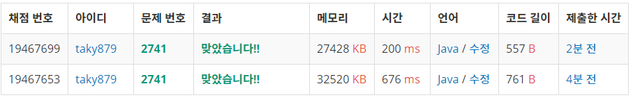 BufferWriter를 사용하는 걸 까먹고 sysout으로 출력해서 제출한 것과 메모리와 시간 차이가 확연하다. 싱기싱기