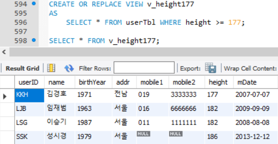위와 같은 뷰에는 사용자의 이름과 주소만 있을 뿐, 시용자의 중요한 개인정보인 출생년도, 연락처, 키, 가입일 등은 들어 있지 않다. 예를 들어 다른 사용자에게 무언가 작업을 맡겼을 때 연락처 등의 중요한 정보에는 접근하지 않고 이름과 주소 데이터만 가지고 작업하도록 할 때 뷰를 사용할 수 있다.