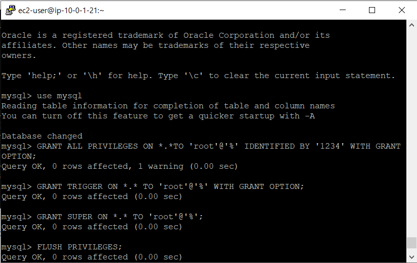 use mysql GRANT ALL PRIVILEGES ON *.* TO 'root'@'%' IDENTIFIED BY '패스워드' WITH GRANT OPTION; GRANT TRIGGER ON *.* TO 'root'@'%' WITH GRANT OPTION; GRANT SUPER ON *.* TO 'root'@'%'; FLUSH PRIVILEGES;