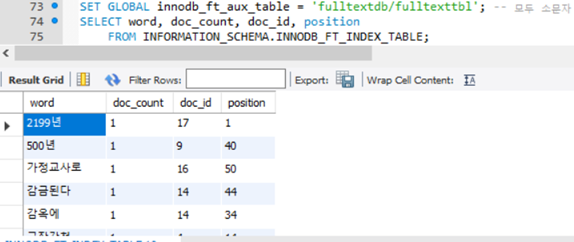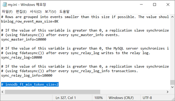 MySQL은 기본적으로 3글자 이상만 전체 텍스트 인덱스로 생성한다. 이러한 설정을 2글자까지 전체 텍스트 인덱스가 생성되도록 시스템 변숫값을 변경한다.